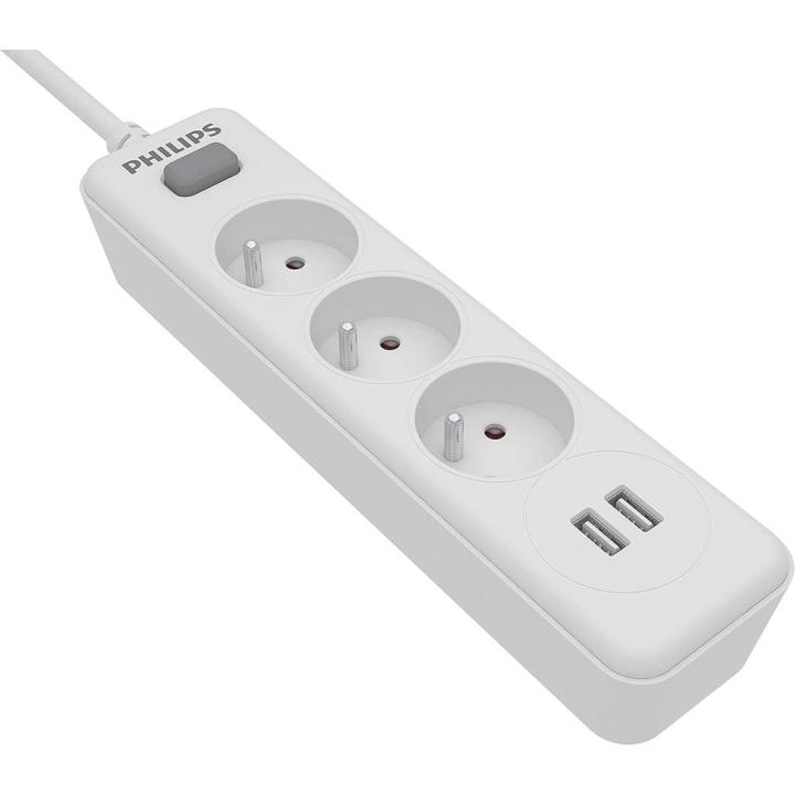 Un cable de alimentación de 2 metros permite acceder a los dispositivos más alejados de la toma de corriente. 3 enchufes y 2 puertos USB La regleta Philips SPN3032WA/10 tiene 3 tomas Type-C diferentes a las que puedes conectar distintos tipos de dispositivos electrónicos. Además, la regleta Philips tiene 2 puertos UBS que puedes usar para cargar un smartphone, unos auriculares inalámbricos o una tableta, por ejemplo.