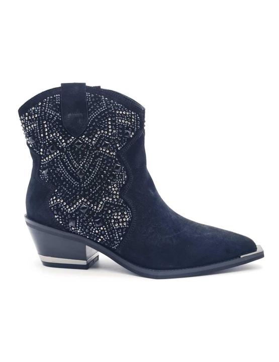 Alma En Pena 197 Negro es un botín estilo cowboy para mujer que te encantará. Fabricado en piel de serraje de primera calidad, este botín destaca por su textura suave al tacto y sus detalles de pedrería en ambos laterales. Con un diseño elegante y sofisticado, este botín presenta una parte delantera terminada en punta y una solapa en la parte superior de ambos laterales de la caña.