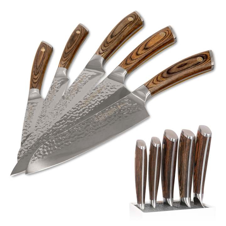 Juego de 5 cuchillos profesionales 3 Claveles Sakura, con hoja forjada martilleada en Acero Inoxidable 3Cr13 de dureza Rockwell HRC57. Mango de madera de Pakka, resistente al calor y la humedad. Ligero de filo liso y punta estable.