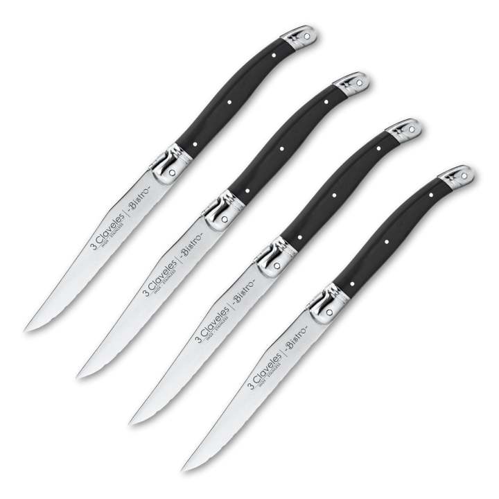 Set de 4 cuchillos chuleteros de 11.5 cm 3 Claveles Bistro ref. 1481 con filo dentado para un corte preciso y sin esfuerzo. Hoja fabricada en acero inoxidable, con mango ergonómico en ABS, muy duradero a la vez que elegante.