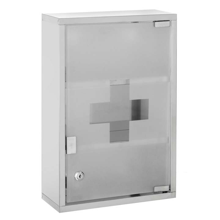 Un práctico y funcional armario de baño botiquín realizado con acero inoxidable en color plateado y puerta de cristal semitraslúcida con llave de seguridad.