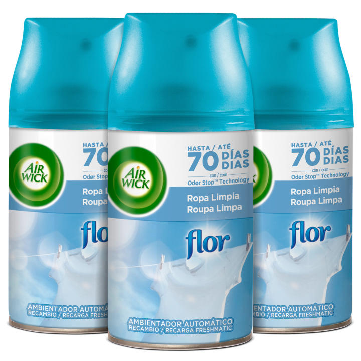 Déjate envolver por una gran variedad de fragancias para el hogar: desde aromas florales y afrutados hasta perfumes más sofisticados como aromas a colada recién lavada, lavanda o cítricos, entre otros muchos. AIR WICK FRESHMATIC Air Wick Freshmatic es un ambientador spray automático que libera fragancia de forma continuada con tecnología Odor Stop para neutralizar los malos olores. Haz que tu hogar desprenda un aroma fresco a ropa limpia.