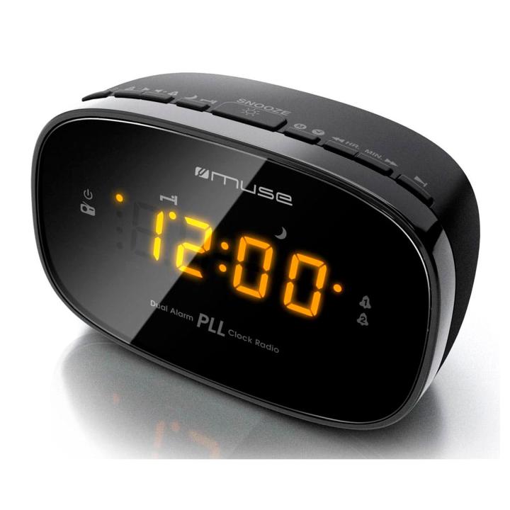 Radio despertador analógico de sobremesa MUSE M-150 CR acabada en color negro, 20 estaciones FM preestablecidas, busqueda y guardado automático de estaciones, sistema doble de alarma, función snooze, pantalla LED blanco de 0.6 pulgadas, intensidad de pantalla ajustable, reloj de 24 horas.