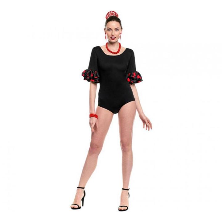 Maillot Sevillana, Flamenca, Gitana, Faralae, Folclórica, Zambra con Volante Lunar negro y rojo para mujer.