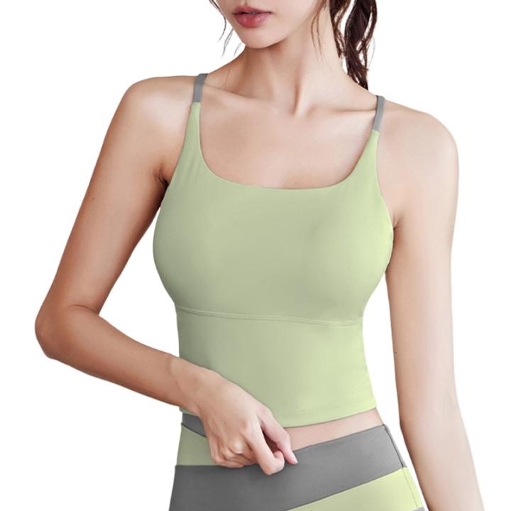 Empalme de dos colores, correas cruzadas delgadas, delinea la línea de la espalda sexy, los senos laterales son rectos y rectos, se niegan a ser incómodos, corte tridimensional 3D, ajuste cómodo, almohadilla para el pecho incorporada, ejercicio ligero, cintura alta y abdomen, circunferencia ensanchada y baja, que brinda un soporte estable durante el ejercicio