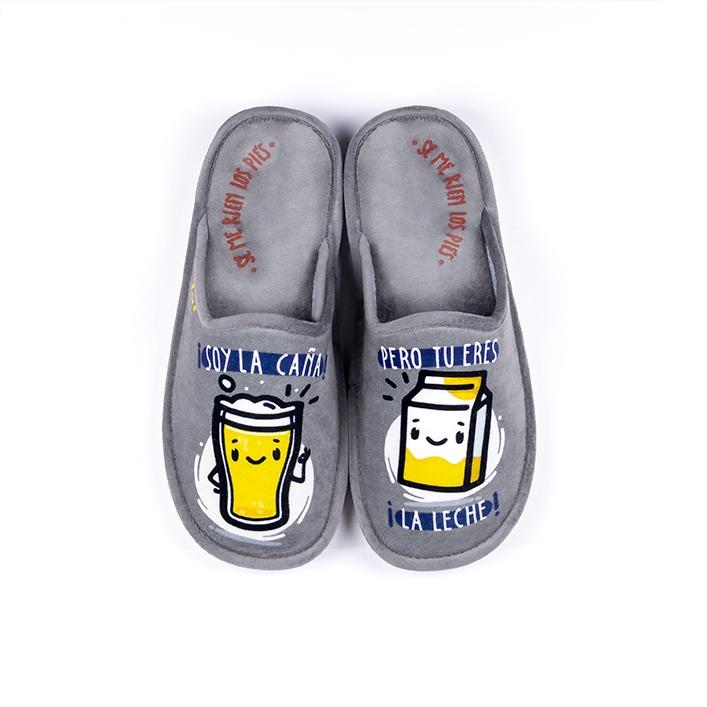 Zapatilla de casa de la marca SE ME RIEN LOS PIES destalonada y punta cerrada. En un tejido suave en color gris con una impresión digital de las frases y dibujos a color en los empeines. Su suela confort la hace muy ergonómica además de ser antideslizante. Fabricada en España.