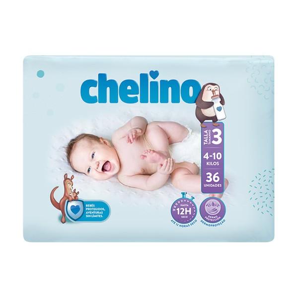36 unidades de pañales Chelino de talla 3 (4-10 kg). Los pañales son finos y tienen un núcleo inteligente con forma anatómica que permite una mayor adaptación al cuerpo y la distribución ultra rápida del pipí, aislando la humedad del culito del bebe para mantener su equilibrio natural.