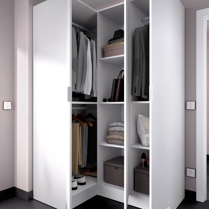 El armario esquinero Essen presume de ser uno de los modelos más buscados en la actualidad. ¡Y no es para menos! Su cuidado diseño y su perfecta distribución interior lo distinguen del resto. Se trata de un armario esquinero compuesto por 1 módulo que le da ese carácter de rincón y 1 módulo recto. Está fabricado en melamina de buena calidad, un material resistente y que aguante sin problemas el paso del tiempo. Con 3 puertas abatibles, este armario cuenta con 3 barras para colgar prendas, 8 estantes y 1 repisa inferior donde colocar los objetos más pesados como cajas, bolsos y zapatos. Ideal para personas que viven solas o para parejas, este armario te enamorará por su diseño. De estilo nórdico, el mueble combinará sin problemas con el resto de los muebles y elementos decorativos de tu dormitorio. ¡No te quedes sin el tuyo!