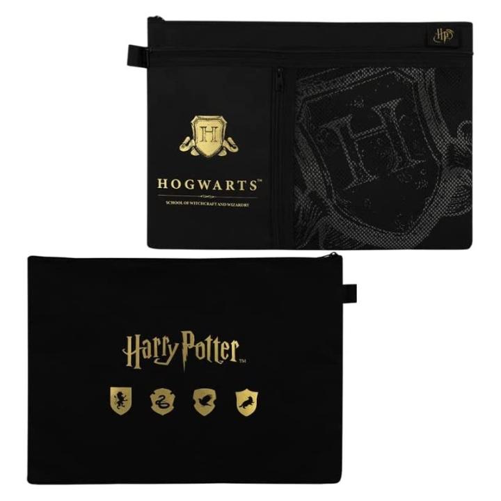 De la marca Blue Sky nos llega un elegante estuche negro y dorado de Hogwarts, el colegio de magia y hechicería más famoso del mundo mágico de Harry Potter. Siéntete como un auténtico alumno de Hogwarts dispuesto a un nuevo curso cuando guardes todos los lápices, bolígrafos y demás accesorios en tu estuche. Tiene tres amplios bolsillos con cremallera para que no pierdas nada por los amplios pasillos del castillo. Tiene los símbolos de las cuatro casas en un lado y en el otro el nombre del colegio y una H dentro de un escudo dorado. Tiene un tamaño aproximado de 25 x 35 x 0,5 cms. Empieza las clases de la mejor forma posible con este estuche de licencia oficial del Wizarding World.