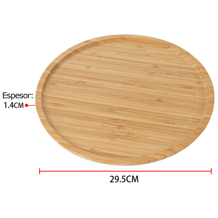 Esta bandeja redonda de bambú para servir combina la funcionalidad con la belleza natural del bambú, ofreciendo una opción sostenible y atractiva para presentar alimentos.