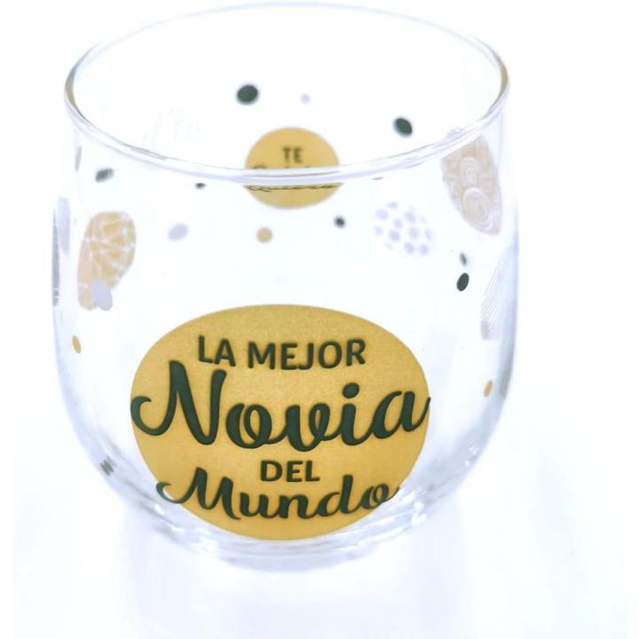 - El vaso incluye la frase "La Mejor Novia del Mundo" y otros elementos y palabras decorativas