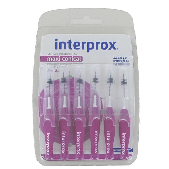 El producto se presenta en un estuche con 6 unidades de cepillos interdentales Dentaid Interprox PHD 2.3 Maxi Conical, cada uno con capuchón protector para garantizar la higiene y facilitar su transporte.