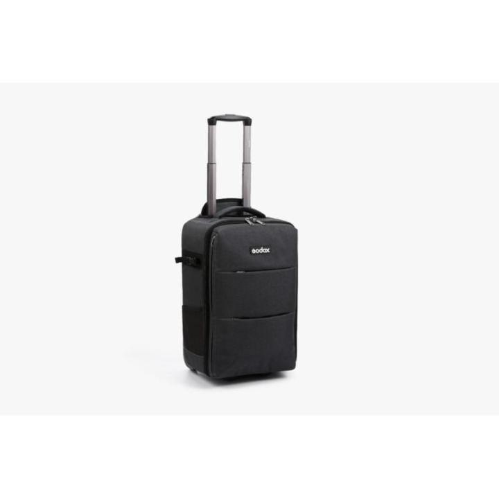 Las dimensiones compactas 55x37x30cm hacen que la bolsa sea práctica y también puede ser adecuada para el transporte en aerolíneas. El interior puede albergar un cabezal de flash AD1200 Pro, un módulo de alimentación y accesorios relacionados. Tiene un asa plegable y ruedas para facilitar su transporte, así como dos bolsillos externos con cremallera y un par de correas externas para sujetar trípodes.
