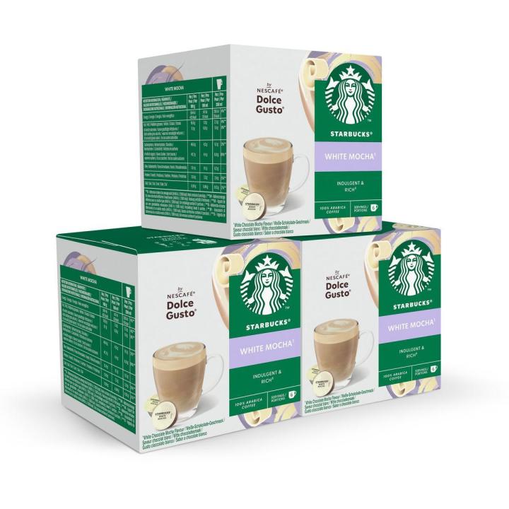 Este café de STARBUCKS® by NESCAFÉ® Dolce Gusto® White Mocha tiene la combinación perfecta de la leche y el sabor del chocolate blanco, coronada por una capa fina de espuma que te hará disfrutar de esta clásica receta elaborada con los mismos granos 100% arábica de alta calidad que en las cafeterías.