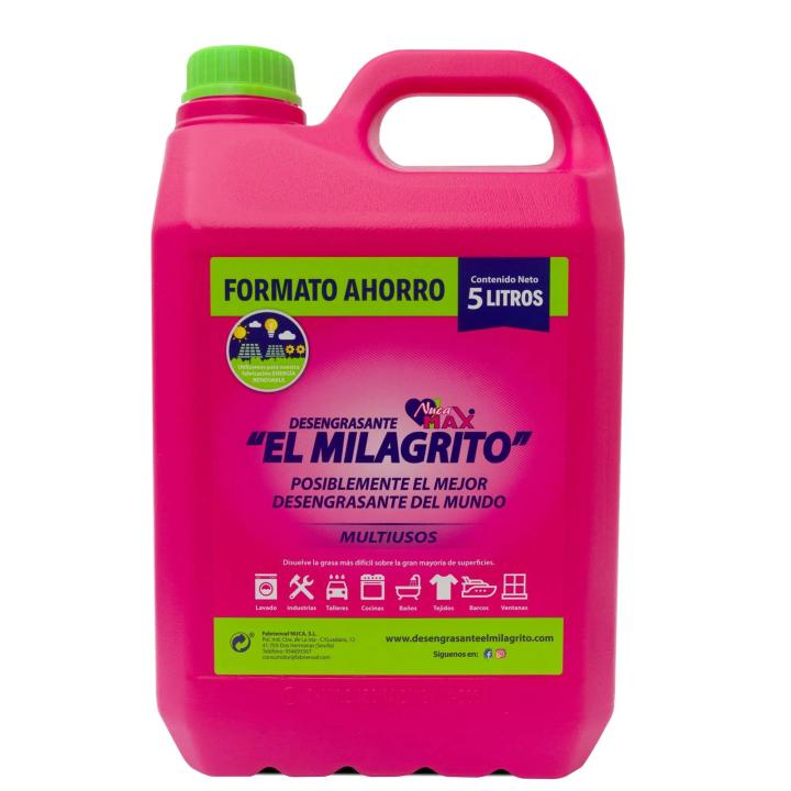 Desengrasante El Milagrito es un limpiador multiusos que disuelve la grasa más difícil sobre la gran mayoría de superficies. Además, es un quitamanchas eficaz, que sobre tejidos de colores sólidos no hay mancha que se le resista. Sirve para limpiar: COCINAS: vitrocerámicas, hornos, fogones, microondas, encimeras, campanas extractoras,suelos, azulejos, grifos, sartenes, cacerolas, barbacoas, paelleras, fregaderos, ventanas… BAÑOS: azulejos, suelos, bañeras, lavabos, grifos, W.C., elimina las molestas manchas de cal, mamparas, persianas, ventanas… TALLERES E INDUSTRIA: herramientas, suelos, motores, ropa de trabajo… TEJIDOS Y CALZADO: ropa, alfombras, zapatillas deportivas… EMBARCACIONES: barcos, lanchas, veleros, canoas, kayak, tablas de surf… Su formato ahorro es perfecto para uso profesional o de repuesto.