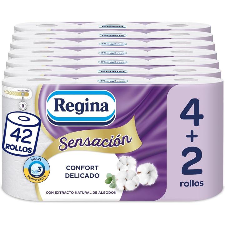 Gracias a sus 3 gruesas capas y delicada loción con extracto de flor de algodón, Regina Sensación de Algodón fuerza sin renunciar a la suavidad: apta para todo tipo de pieles, incluso las más sensibles, proporciona un confort absoluto con cada uso, durante todo el día. El embalaje está hecho de plástico 50% reciclado y es fácilmente reciclable; contiene 6 rollos de papel higiénico de 3 capas, cada uno con 173 hojas. Con un diseño de fácil apertura que permite abrir el paquete de forma rápida y cómoda con un simple gesto. Si quiere hacer una elección responsable, en apoyo al medio ambiente, elija Regina Sensación de Algodón: fabricado en 100% celulosa FSC, es biodegradable y producido con materias primas certificadas a partir de bosques gestionados de forma responsable. Regina Sensación de Algodón es un producto de Sofidel, una empresa italiana que, a través del uso de tecnologías innovadoras, promueve proyectos destinados a garantizar la higiene, la salud y el bienestar para reducir su huella ambiental. Sofidel fue la primera empresa de la industria del papel higiénico y doméstico en firmar un acuerdo en 2008 para unirse a WWF Climate Savers, un programa para reducir las emisiones de gases de efecto invernadero. Regina, Paper for People.