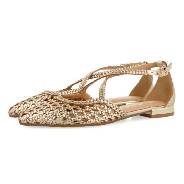 Bailarinas modelo Leskovic de la marca española Gioseppo fabricadas en piel trenzada de color platino, con detalle de trenzas sobre el empeine. El cierre es ajustable mediante hebilla al tobillo. EL forro es de piel. La plantilla es acolchada de piel curtida en un proceso de curtición más sostenible bajo los estándares de Leather Working Group. EL piso es flexible.