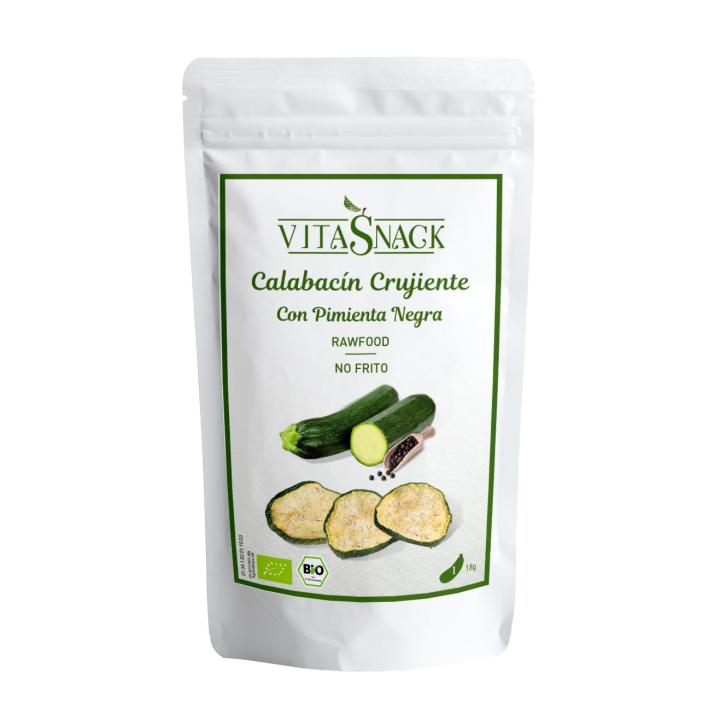 Los cortes crujientes de calabacín ecológico con pimienta negra de VitaSnack, sin freír, sin sal y sin gluten, tienen una sorprendente textura y un intenso sabor tradicional. Son la alternativa saludable a los snacks convencionales.