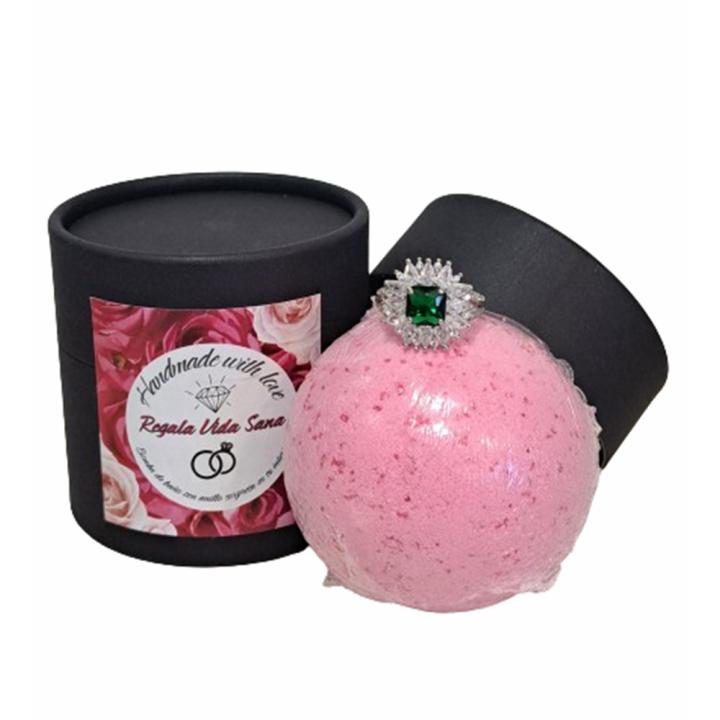Bomba de baño efervescente con joya anillo sorpresa en su interior . Bomba de baño con sal marina y aceite de coco . Con un peso de 135g capaz de perfumar una bañera grande . Instrucciones de uso Prepara un baño de agua caliente, saca la bola de baño de su envoltorio de plástico y sumérgela en el agua. Deje que se diluya y evite tocarla. Una vez que la bola de baño se haya disuelto, ¡averigua tu Anillo sorpresa que se esconde en ella! No tragar o frotar directamente sobre la piel. Enjuague su piel y la bañera después de su uso. En caso de alergia, interrumpa el uso y consulte a un médico. Producto no recomendado para mujeres embarazadas.