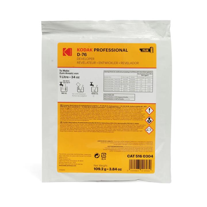 Famoso por su confiabilidad, el revelador KODAK PROFESSIONAL D-76 es una opción fantástica para fotógrafos que buscan una velocidad de emulsión completa y un excelente detalle de sombras. El concentrado de revelador en polvo se mezcla con agua para preparar 1 litro de solución madre. Para lograr una mayor nitidez con un grano ligeramente más grande, la solución madre se puede diluir aún más a 1:1.