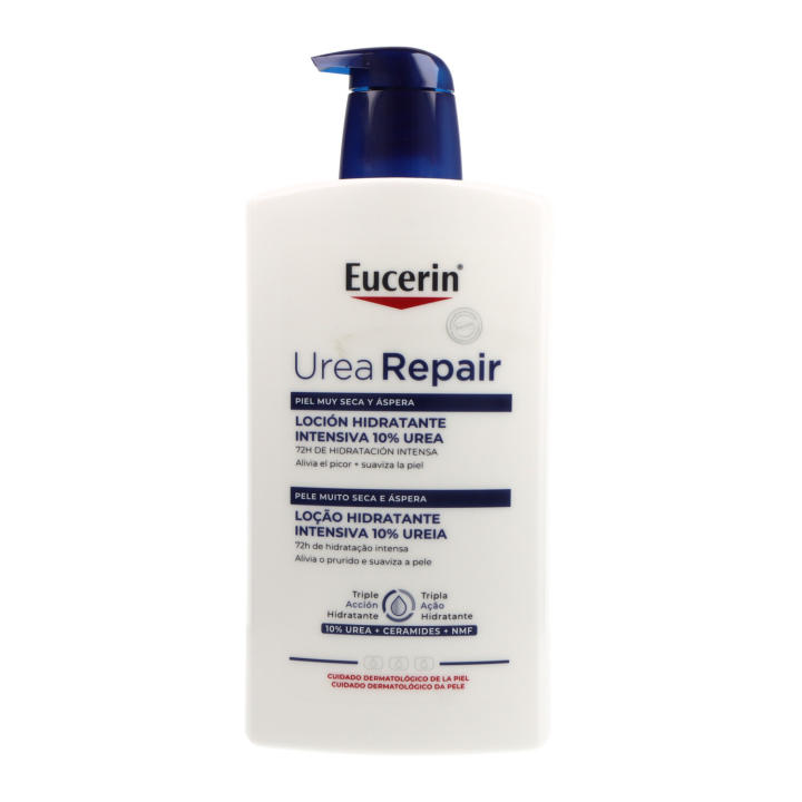 Loción hidratante Eucerin Urea Repair con 10% de urea para pieles secas, descamadas y con picor. Absorción rápida y sin perfume en envase práctico de 1000 ml.