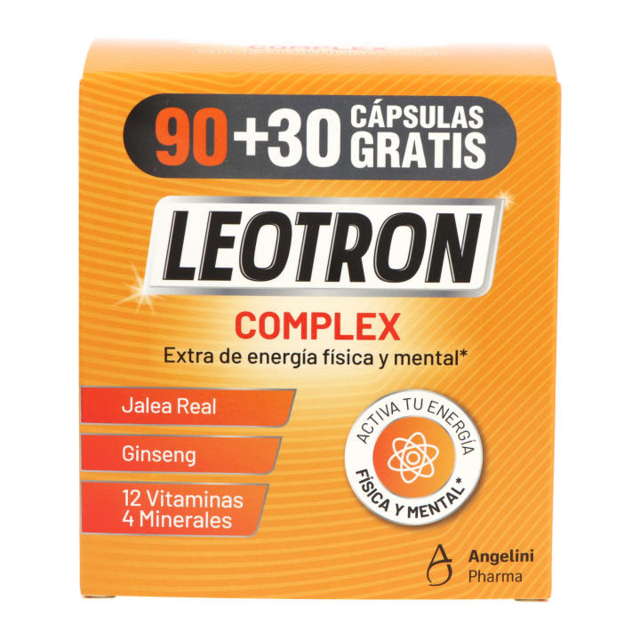 Tipos de nutrientes y sus característicasLeotron Complex 90+30 Caps Promo es un complemento alimenticio de origen natural que ayuda a aumentar la vitalidad y energía del cuerpo, a la vez que combate el cansancio y la fatiga. | Alérgenos alimentariosAceite de girasol, Sulfato de magnesio, Gelatina, Aceite de soja parcialmente hidrogenado, Vitamina C, Glicerina, Extracto de Panax ginseng, Lecitina de soja, Fosfato dicálcico anhidro, Gluconato de potasio, Jalea real liofilizada, Sulfato de zinc, Vitamina E, Nicotinamida, Vitamina B5, Sulfato de manganeso, Óxido de hierro (Colorante), Vitamina A, Vitamina B12, Vitamina B1, Vitamina B6, Vitamina B2, Vitamina B9 (Ácido fólico), Vitamina D, Yoduro de potasio, Biotina |