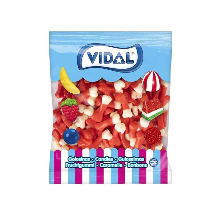 Chucheria en forma de hueso con un increíble sabor a fresa y una textura de gelatina irresistible. Golosina original de Vidal Golosinas. Ideal para cualquier fiesta temática