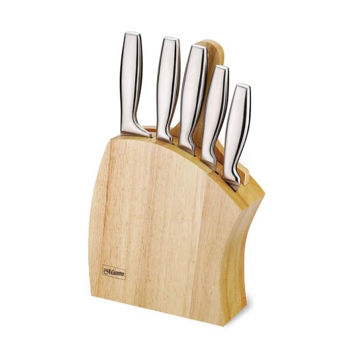 【SET COMPLETO】 Con este set de cocina tendrás el cuchillo adecuado para cada taréa: 1 Cuchillo Chef, 1 Cuchillo para deshuesar, 1 Cuchillo para filetear, 1 Cuchillo universal, 1 Cuchillo pelador, 1 Tabla de cortar de madera., 【SOPORTE DE MADERA】 Olvídate de buscar los cuchillos en el cajón de la cocina mezclados con el resto de cubiertos. Puedes almacenarlos fácilmente en el bloque de madera, adecuado para cualquier cocina elegante, clásica o moderna., 【CORTE PERFECTO】 Las hojas resistentes a la corrosión y flexibles mantienen un óptimo afilado durante mucho tiempo. Podrás trocear y picar fácilmente carnes y pescados y también pelar frutas y verduras sin esfuerzo., 【HOJAS DE ACERO INOXIDABLE】 Las hojas de los cuchillos están fabricadas con acero inoxidable de alta calidad que garantiza gran resistencia al desgaste, y larga durabilidad, además evita la proliferación de bacterias., 【ERGONÓMICOS】 El mango y la hoja del cuchillo están integrados formando una sola pieza. Ofrecen un cómodo agarre para facilitar las labores de corte de alimentos. Las cuchillas son aptas para lavavajillas.