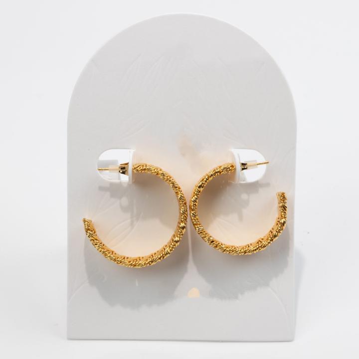 Descripción: Pendientes en forma de aro con un diseño trenzado y un acabado dorado, ideales para quienes buscan un estilo moderno y sofisticado.
