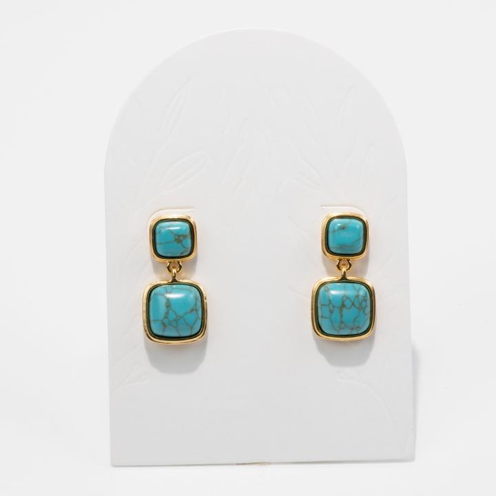 Descripción: Los pendientes Esplendor Turquesa capturan la esencia de la naturaleza con su impresionante piedra turquesa, complementada con una base de aleación de zinc que ofrece durabilidad y elegancia. Perfectos para añadir un toque de color a cualquier atuendo.