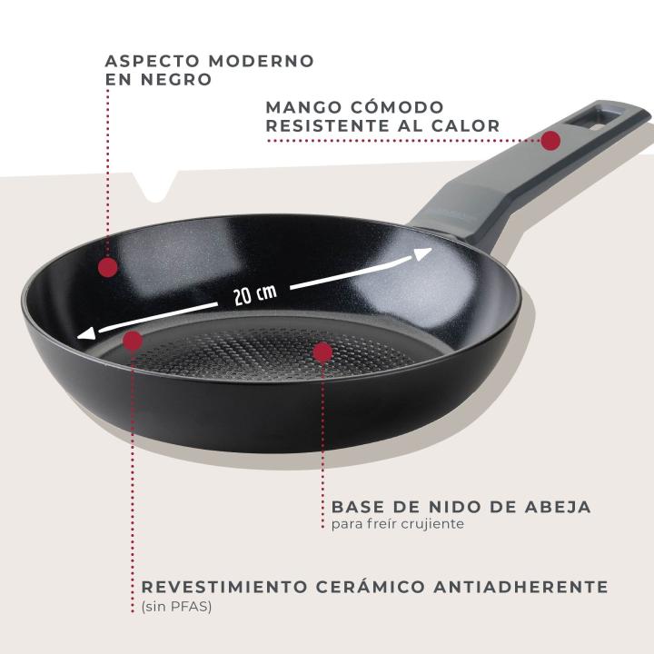 Descubre la Sartén de Fackelmann, una sartén de 20 cm reciclada de aluminio con revestimiento antiadherente de cerámica. Este revestimiento, libre de PFAS, asegura una cocción saludable y una limpieza rápida y sin esfuerzo.La estructura de panal en el interior de la sartén garantiza un resultado de fritura extra crujiente, realzando el sabor y la textura de tus platos. Además, es apta para todo tipo de cocinas, incluyendo inducción, lo que la convierte en una opción versátil para cualquier hogar.El mango de bakelita es ergonómico y resistente al calor hasta 150 grados, lo que te permite cocinar de manera segura y cómoda. Además, su diseño en negro sombra y gris ceniza se adapta a cualquier estilo de cocina.Esta sartén viene con una garantía de 3 años para asegurar la calidad y durabilidad del producto. En Fackelmann, tu satisfacción es nuestra prioridad.La Sartén de Fackelmann es la elección perfecta para los amantes de la cocina que buscan una opción ecológica y sostenible sin comprometer la calidad y el rendimiento.