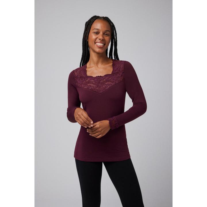 Camiseta térmica de manga larga para mujer con elegante cuello cuadrado y detalles de encaje en el escote y los puños. Confeccionada en tejido térmico suave, proporciona un nivel de termicidad que ofrece confort y calidez en días fríos sin sacrificar el estilo. Su diseño liso y femenino la convierte en una prenda versátil, perfecta para lucir como interior o como parte de un look casual invernal.
