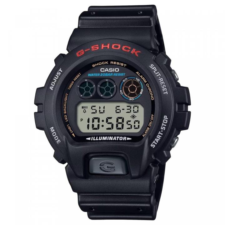 Este reloj Casio G-Shock DW-6900U-1ER orientado para hombre, tiene la caja circular de resina. El brazalete es de resina. Color de la esfera negro. El cristal es mineral, el movimiento cuarzo y el display digital. Impermeabilidad: 20 ATM. Funciones: Cronómetro de 1/100 segundos Capacidad de medición: 00'00"00~59'59"99 (durante los primeros 60 minutos) 1:00'00~23:59'59 (después de 60 minutos) Unidad de medición: 1/100 segundos (durante los primeros 60 minutos) 1 segundo (después de 60 minutos) Modos de medición: Tiempo transcurrido, fracción de tiempo y tiempo del primer y segundo puesto. Temporizador de cuenta atrás Unidad de medición: 1 segundo Intervalo de cuenta atrás: 24 horas Rango de ajuste de la hora de inicio de la cuenta atrás: Entre 1 segundo y 24 horas (incrementos de 1 segundo, de 1 minuto y de 1 hora) Otros: Repetición automática. Señal de hora. Alarma multifunción. Alerta luminosa Parpadea con una señal acústica para las alarmas, las señales de hora y la alarma de temporizador de cuenta atrás. Luminosidad de la retroiluminación LED (superiluminador). LED: blanco. Calendario automático completo (hasta el año 2099). Precisión: ±15 segundos al mes. Formato de 12 y 24 horas. Indicación de la hora normal: hora, minutos, segundos, p.m., mes, fecha y día. Diámetro: 53.2 mm. Peso: 67 gr. Disfruta tú reloj Casio G-Shock.