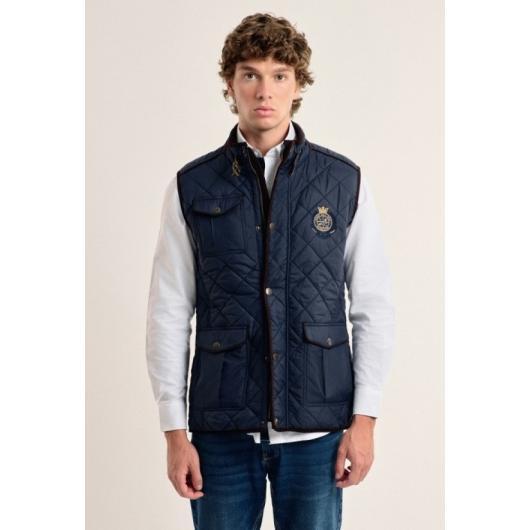 Chaleco Husky azul marino con interior en polar, bolsillos parches con snaps personalizados y escudo bordado en el pecho.