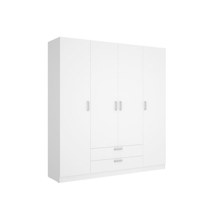 El armario Maxi es la solución perfecta para quienes buscan un ropero de gran capacidad con un diseño moderno y funcional. Con una altura de 215 cm, este armario cuenta con cuatro puertas batientes y dos cajones amplios, ofreciendo un espacio ideal para organizar toda tu ropa y accesorios. En su zona central, dispone de dos puertas con una barra de colgar de aluminio y un estante superior, perfectos para colgar prendas largas o voluminosas. Además, los dos cajones inferiores, equipados con guías metálicas de suave deslizamiento, permiten guardar otros artículos de manera accesible y ordenada. A cada lado del compartimento central, Maxi ofrece una puerta con tres estantes interiores que brindan aún más espacio para prendas dobladas, accesorios o cajas organizadoras.