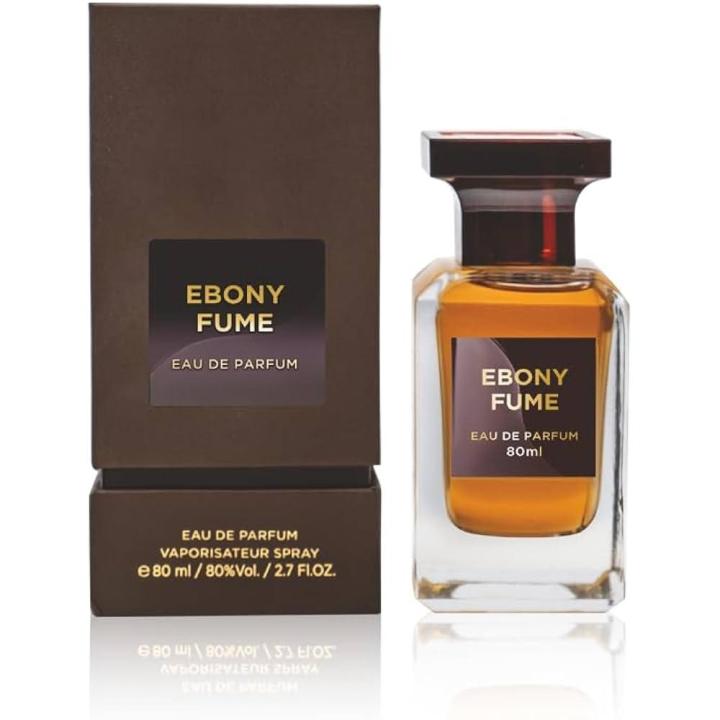 Ebony Fume de Fragrance World es una fragancia de la familia olfativa para Hombres y Mujeres. Ebony Fume se lanzó en 2018. Las Notas de Salida son incienso, palo santo, pimienta negra y hojas de violeta; las Notas de Corazón son papiro de Egipto, ládano, Petróleo de Cade, cuero y rosa; las Notas de Fondo son resinas, árbol de ébano y madera de gaiac.