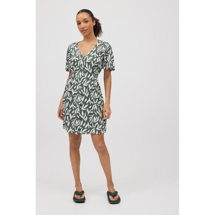 Vestido corto con estampado de hojas. Cuello en V y abotonado. Ajustado a la altura de la cintura por los laterales para ajustarse cómodamente a la figura. Combínalo con unas chanclas y bolso de la colección para ir ideal este verano.