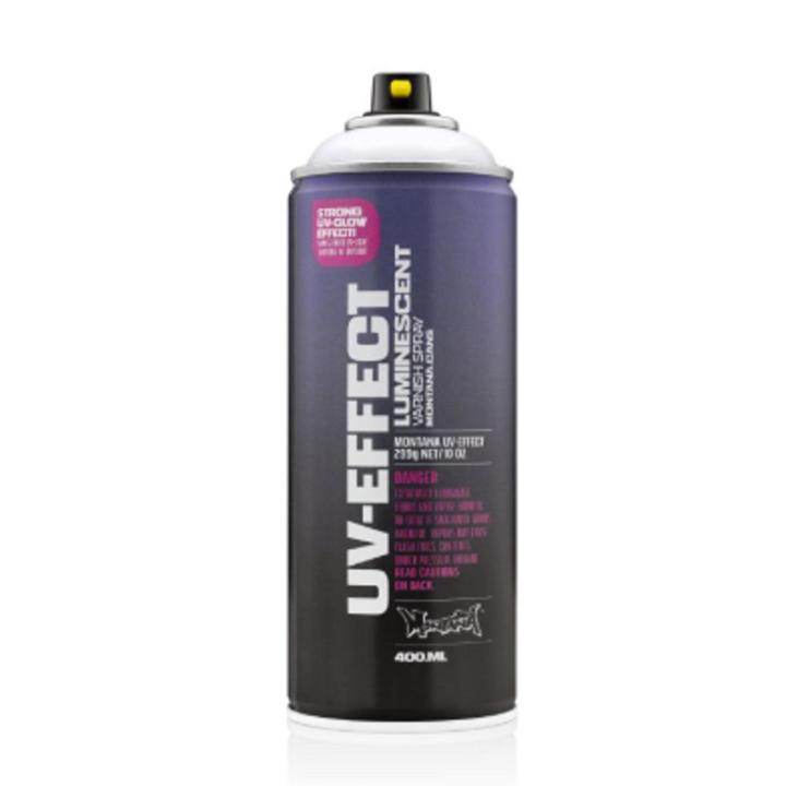 Montana UV-EFFECT es una pintura de efecto transparente que solo es visible bajo la luz ultravioleta directa. Esta pintura EFFECT se puede aplicar sobre casi cualquier superficie. La pintura incolora y semibrillante no es visible a la luz del sol, pero se ilumina cuando se expone a la luz ultravioleta con un color azul violeta brillante.