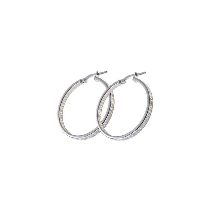 Aros clásicos de 25 mm elaborados en plata de ley con un elegante ancho de 3 mm y un delicado diseño de greca que aporta estilo y sofisticación.