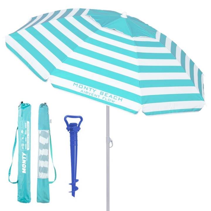 Sombrilla playa antiviento, de 200 cm, y soporte de arena, está fabricada con la cubierta de tejido Oxford 90 G, de rayas marineras, en aguamarina y blanco, con revestimiento plateado, de protección solar UPF+50, es antiviento, con sistema de ventilación Airvent flow, y lleva varillas extra flexibles, de fibra de vidrio, el mástil es inclinable y regulable en altura, con bloqueo de seguridad, de acero tubular de 28-32 mm, blanco, con revestimiento de pintura Epoxi anticorrosión.