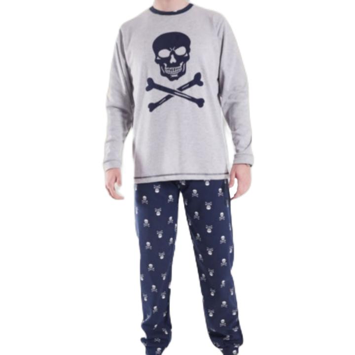 Pijama de invierno para hombre de la marca M.J. Catana. Pijama de punto de algodón perchado (afelpado), formado por camiseta de manga larga y pantalón largo. Camiseta de manga larga, cuello redondo y puños en las mangas. El pantalón cuenta con puños elásticos en los bajos.