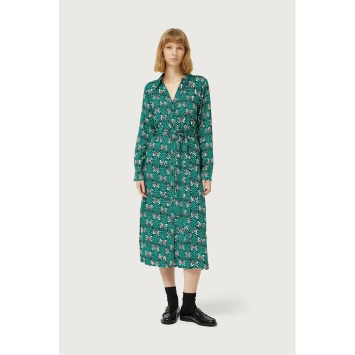 Vestido midi con estampado geométrico de color verde y blanco.
