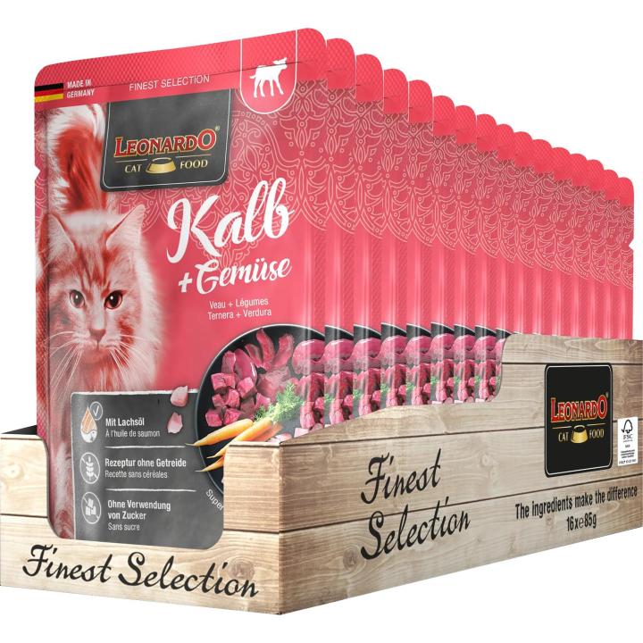 Leonardo Finest Selection es un alimento completo para gatos adultos. Con aceite de salmon. Alto contenido en carne y vísceras. Receta sin cereals. Fabricado sin azúcar.