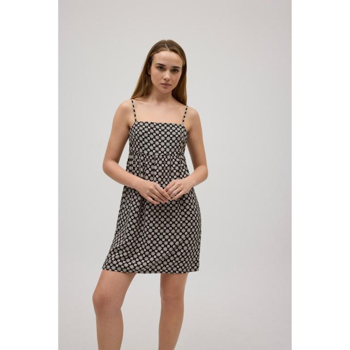 Añade un toque desenfadado y femenino a tus looks de verano con este vestido corto de tirantes regulables. Confeccionado en 100% viscosa, su tejido es ligero y fresco, ideal para los días más cálidos. Su diseño combina una parte superior ajustada que realza la silueta y una falda fluida, que aporta movimiento y comodidad. El estampado floral en blanco y negro lo convierte en un básico versátil, fácil de combinar para cualquier ocasión.
