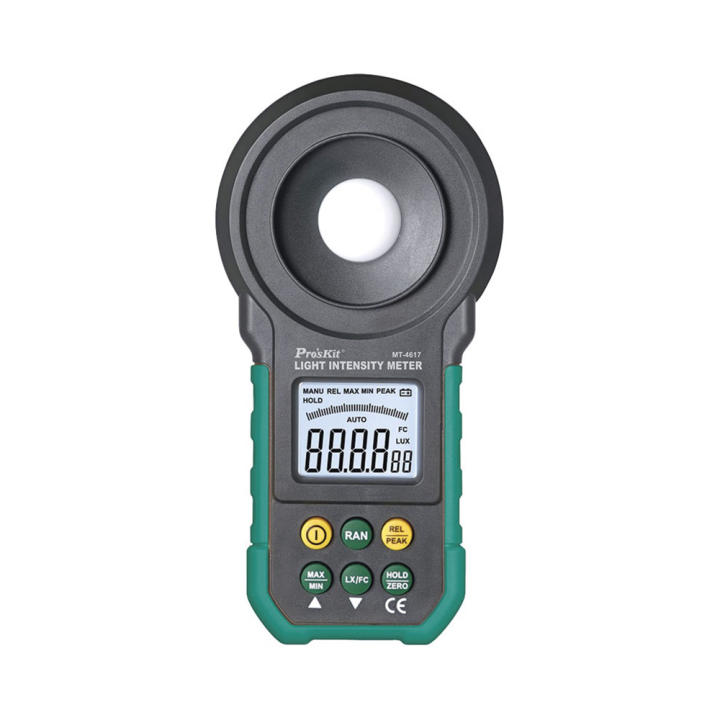 Medidor de intensidad de luz o fotómetro digital de gran precisión. ideal para fotógrafos, interioristas, escenógrafos, etc. para los que la precisión en la luz es esencial. especificaciones: función de autorango, retención de datos, medición de valores máximos y relativos, función de calibrado, pantalla lcd con indicador estilo analógico, conversión de unidades de medida, función de autoapagado e indicador de batería baja, indicador de medición fuera de rango, apto para medidas de luz led de colores y ajuste de la selección de color y parámetros de la fuente de luz a medir. alimentación: 1 pila de 9v 6lr61 (no incluida). aplicación: luxómetro para luz led y estándar. dígitos: 3 y 1/2 dígitos. escala: 20-200k lux, 20-20k fc (foto candelas). nota: 1 fc 10,764 lux, 1 lux 0,09290 fc (foto candela). ref. fabricante: mt-4617led. resolución: 0,00 - 200000 lux. tamaño: 85 x 45 x 170 mm