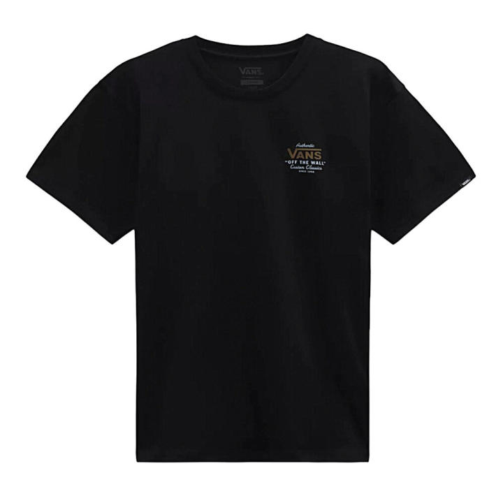 Camiseta Negra Vans Holder Classic Black/Antelo Suave Y Cómoda Esta camiseta de manga corta en un bonito color negro es una prenda genial para tu día a día. Está hecha de un tejido suave y cómodo para que te sientas bien todo el tiempo que la lleves puesta. Tiene un cuello redondo sencillo. En la parte delantera, a la izquierda del pecho, tiene un diseño estampado con el logo de Vans y algunas letras que le dan un toque original. Y en la parte trasera, el mismo logo cubriendo a espalda.Es súper fácil de combinar con tus pantalones, shorts o faldas favoritas. Puedes ponértela para ir al cole, salir con tus amigos o simplemente para estar cómodo en casa. ¡Es una camiseta básica que siempre queda bien!Características principales: Color: Negro Manga: Corta Cuello: Redondo Detalle Frontal: Diseño estampado con logo y texto de Vans en el lado izquierdo del pecho. Detalle Trasero: Pequeño logo de Vans en la parte de atrás del cuello. Tejido: Suave y agradable de llevar Estilo: Casual y fácil de combinar Perfecta para: Cualquier ocasión informal¡Añade esta camiseta negra de Vans a tu colección y disfruta de un estilo cómodo y con un toque original!