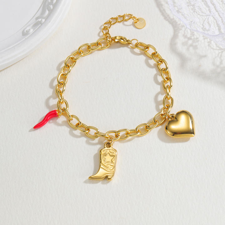 Pulsera de Acero Inoxidable con Charms de Corazón, Bota y Cuerno Rojo – Acabado Dorado