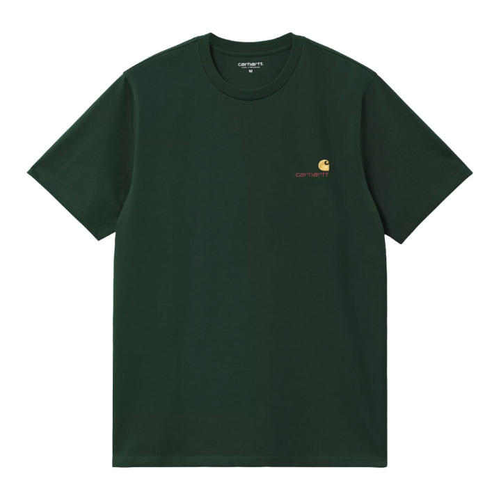 Camiseta Verde Carhartt American Script T-Shirt Conifer de Corte HolgadoS/S American Script T-ShirtLa S/S American Script T-Shirt está confeccionada en punto de algodón orgánico. Presenta nuestro logotipo con texto en dos tonos bordado en el pecho. Corte holgado. I029956_CI_XX La altura del modelo es de 183 cm y usa la talla M loose fit bordado con texto