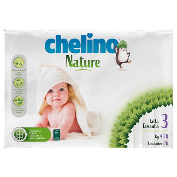 Los pañales Chelino Nature® talla 3 son ideales para bebés de 4 a 10 kg, ofrecen hasta 24 horas de sequedad. Fabricados con fibras naturales de bosques sostenibles, libres de látex y perfumes, cuidando la piel del bebé y el medio ambiente.