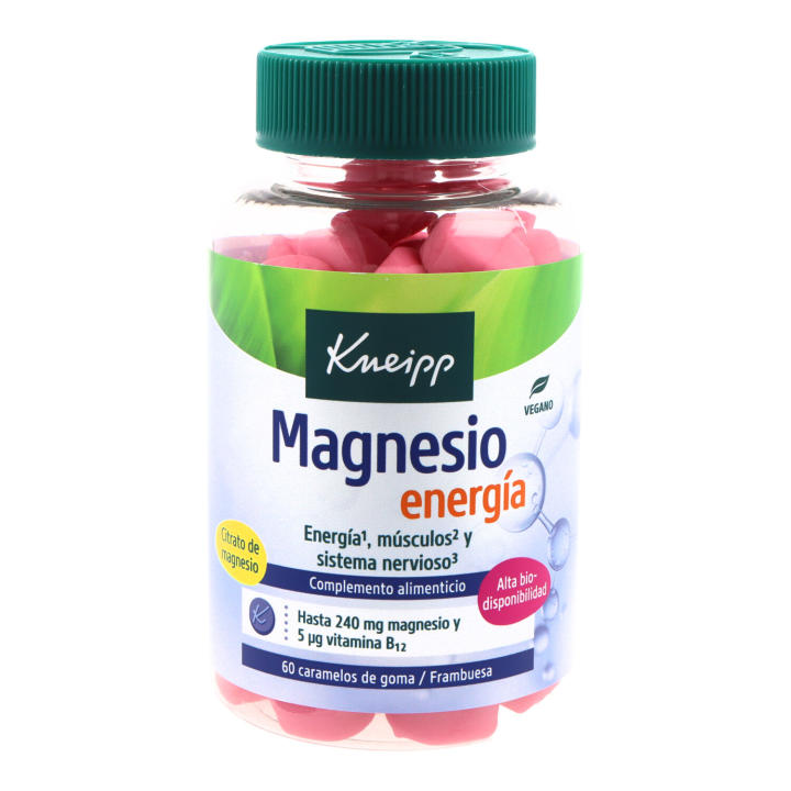 Contenido de la etiqueta de nutrición<h3>DESCRIPCIÓN DEL PRODUCTO</h3> <p>Kneipp Magnesio Energía son gominolas diseñadas para apoyar el metabolismo energético y disminuir la sensación de fatiga. Cada caramelo combina magnesio y vitamina B12, nutrientes esenciales que favorecen el correcto funcionamiento de los músculos y el sistema nervioso. Su agradable sabor a frambuesa y su formato masticable las hacen una opción práctica y deliciosa para complementar la dieta diaria.</p> <h3>COMPOSICIÓN DEL PRODUCTO</h3> <ul> <li>Magnesio (citrato de magnesio): contribuye al funcionamiento normal de los músculos y del sistema nervioso.</li> <li>Vitamina B12 (cianocobalamina): ayuda al metabolismo energético y a reducir el cansancio y la fatiga.</li> <li>Otros ingredientes: jarabe de glucosa, azúcar, agua, gelificante (pectina), acidulante (ácido cítrico), corrector de acidez (citrato trisódico), colorantes (concentrados de zanahoria y arándano), aroma natural, aceite vegetal, agente de recubrimiento (cera de carnauba).</li> </ul> <h3>MODO DE EMPLEO</h3> <ul> <li>Tomar dos gominolas al día.</li> <li>No superar la dosis diaria recomendada.</li> </ul> <h3>ADVERTENCIAS</h3> <ul> <li>Los complementos alimenticios no deben sustituir una dieta equilibrada y un estilo de vida saludable.</li> <li>Mantener fuera del alcance de los niños más pequeños.</li> <li>No apto para mujeres embarazadas, en periodo de lactancia ni para personas con insuficiencia renal.</li> <li>El consumo de más de 250 mg de magnesio puede tener efectos laxantes en personas sensibles.</li> <li>Conservar en un lugar seco, protegido de la luz solar directa y a una temperatura inferior a 25ºC.</li> </ul> |
